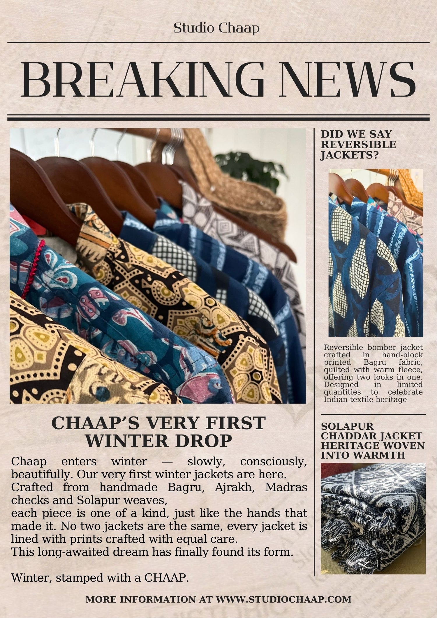 Winter arrives at CHAAP gently and consciously. Our first winter collection are crafted from heritage textiles — Bagru, Ajrakh, Madras Checks, and Solapur weaves — each handmade, each one of a kind.