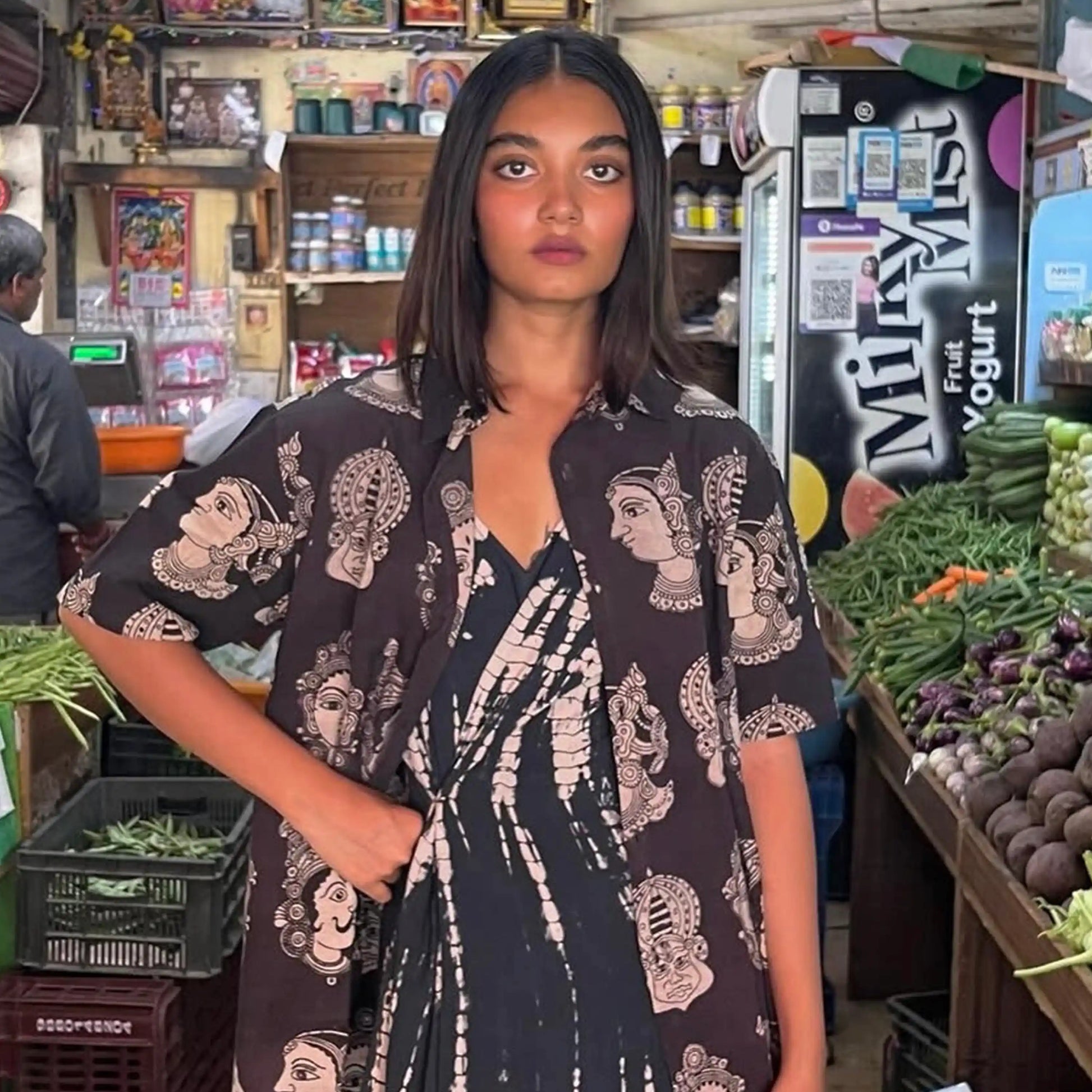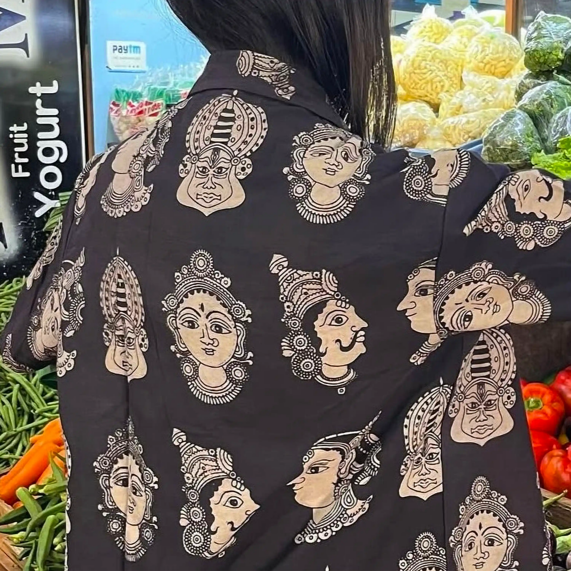 Add a touch of heritage to your wardrobe with the Half Kathakali in Black Kalamkari Cotton Shirt. Featuring the vibrant classical dance form of Kerala—this shirt showcases intricate motifs against a versatile black backdrop, this shirt is a testament to the timeless beauty of authentic Kalamkari art.