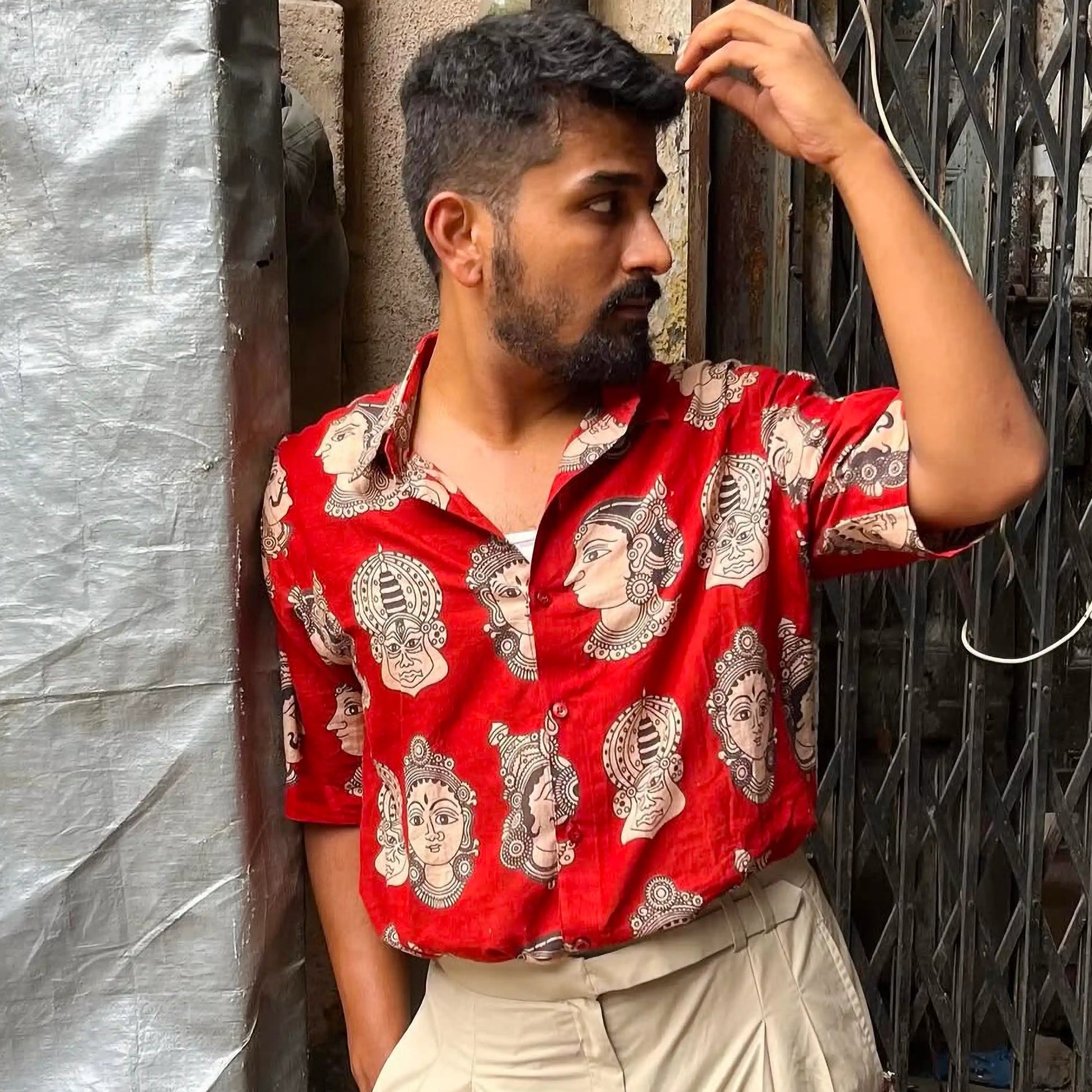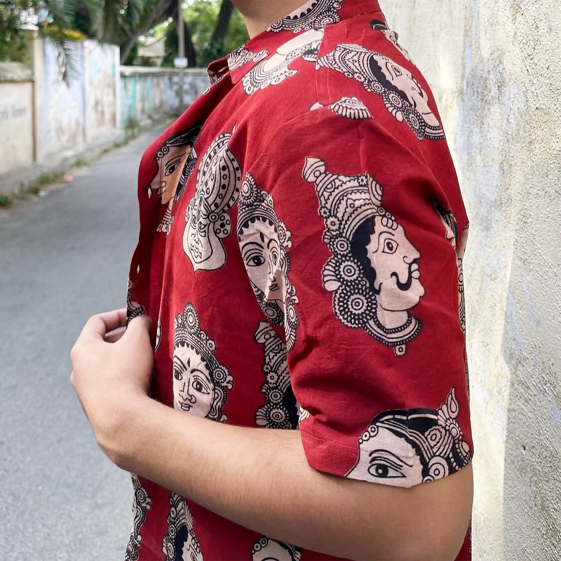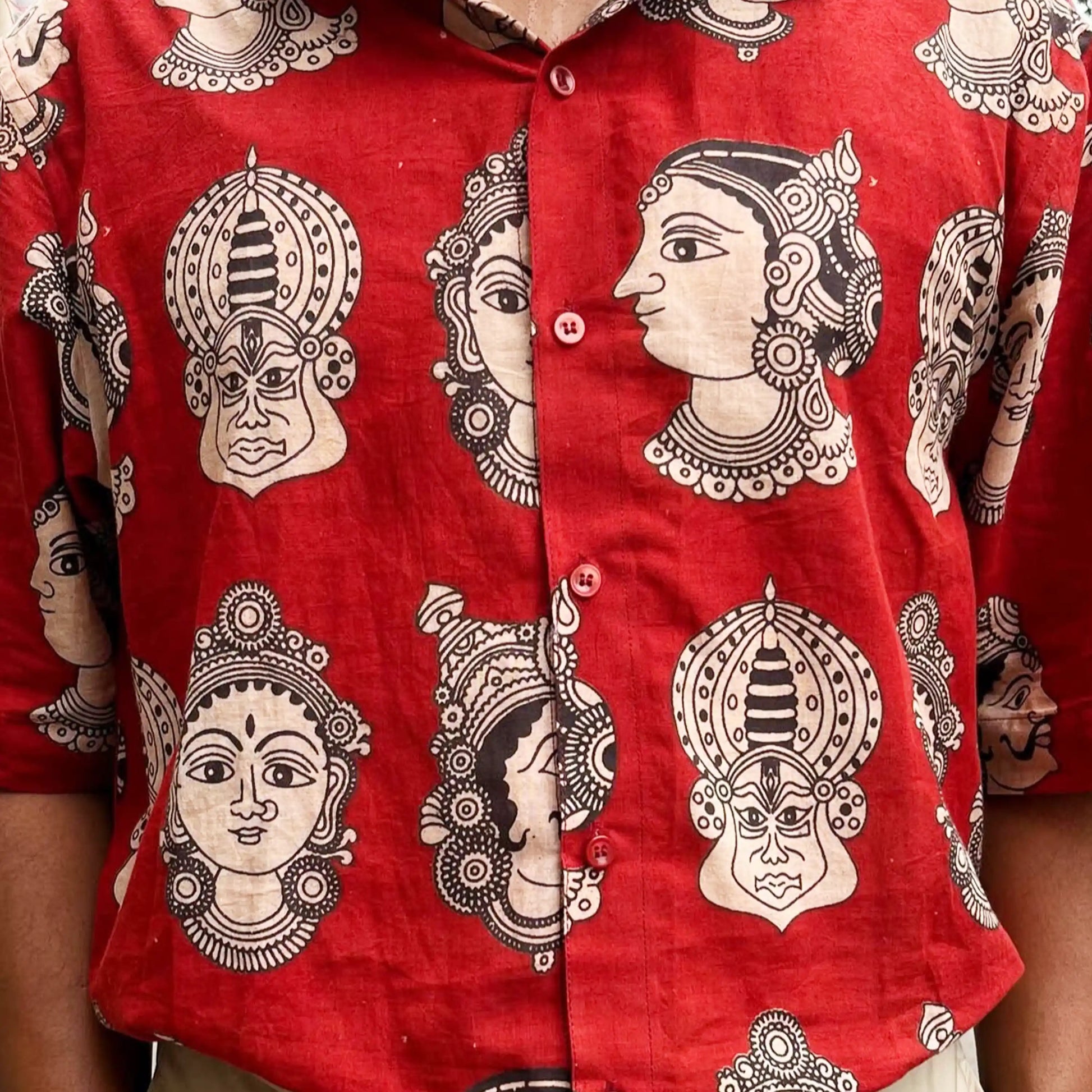 Bring a touch of India’s timeless performance art to your everyday style with Chaap’s Half Kathakali in Red Cotton Unisex Shirt. Inspired by the captivating expressions and bold theatrics of Kathakali—one of Kerala’s most revered classical dance forms—this half-sleeve shirt features striking motifs against a vibrant red backdrop.