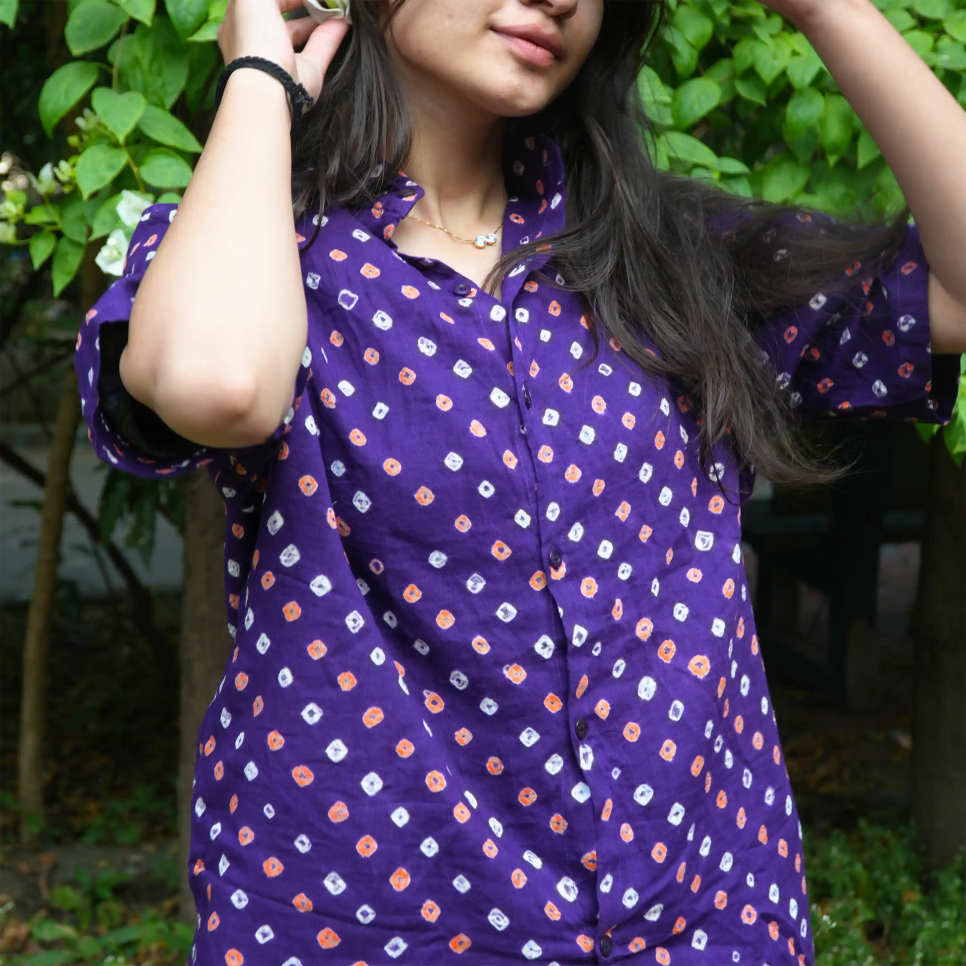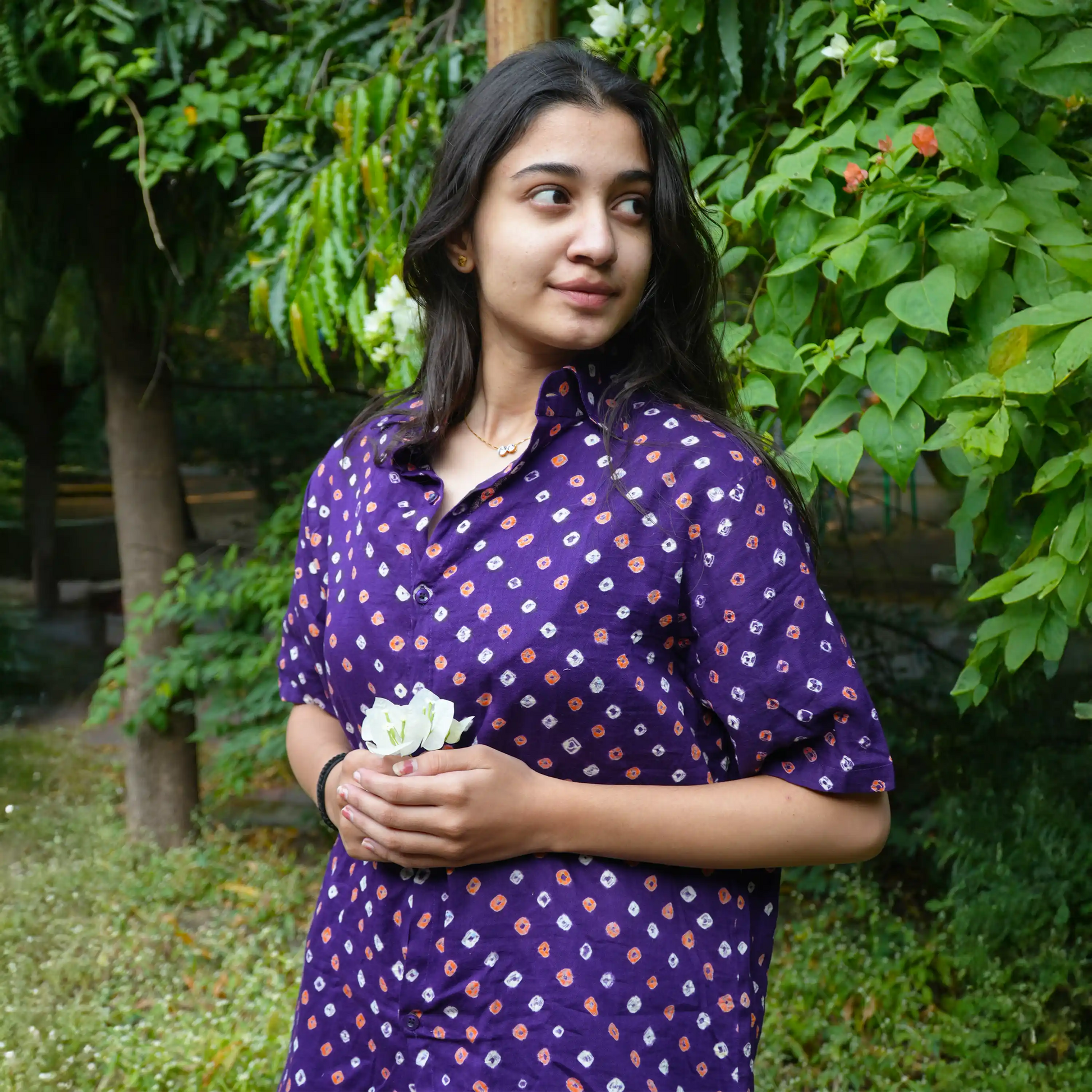 Celebrate timeless elegance with our Purple Bandhani Cotton Shirt, a perfect blend of tradition and contemporary style. Handcrafted with care in India, this shirt features an authentic Bandhani print, a revered textile art known for its intricate tie-dye patterns and cultural richness.