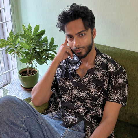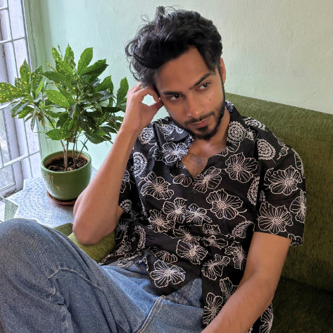 This black shirt blooms with bold white embroidery, like night-blooming jasmine under moonlight. Handcrafted with care, it carries the mystery of midnight gardens and the softness of a summer breeze.